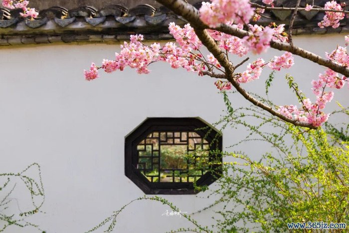 白墙黛瓦前静放的樱花